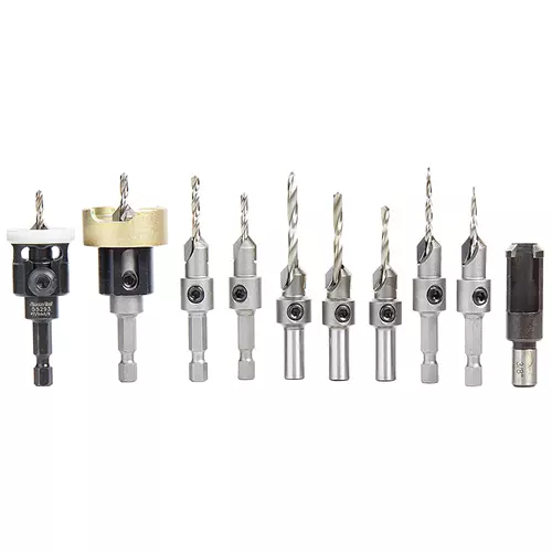 Includes:T32944, #8 Screw 3/8" x 7/64" x 1/4" Carbide Tipped 82 Deg. Countersink Taper T32945, #10 Screw 3/8" x 1/8" x 1/4" Carbide Tipped 82 Deg. Countersink Taper T32932, #4 Carbide Countersink w/ Low Friction Depth Stop Quick Release Hex Shank #6 Screw 3/8" x 1/8" x5/16" Round Shank #6 Screw 3/8" x 1/8" x 5/16" Round Shank #8 Screw 25/64" x 9/64" x 5/16 Round Shank #8 3/8" x 48° x 1/4" Hex Shank #10 3/8" x 49° x 1/4" Hex Shank 3/8" x 1/8" x 1/4" Hex Shank with adjustable depth stop Straight Wood Plug Cutter, 3/8" x 3/8" x 2"