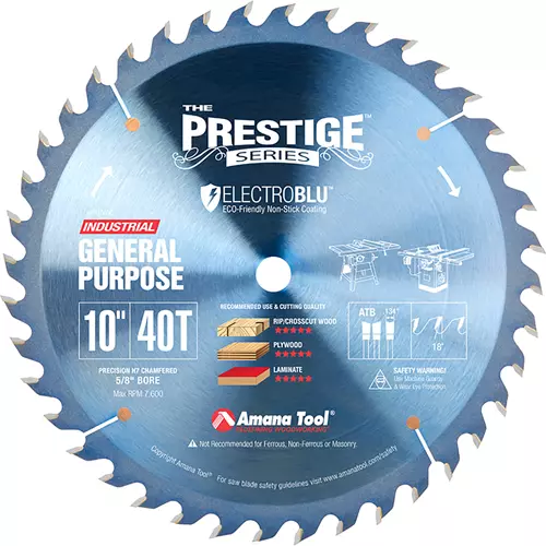 The Amana Tool® Prestige™ general-purpose blade cuts smoother and stays sharper, for longer, in solid wood, plywood, MDF and chipboard. It features a massive tool-steel plate (.102" thick!) with expansion slots and copper plugs that practically eliminate vibration. The 40 teeth are ground with a steep 20° bevel angle, alternating left and right, for crisp, clean cuts both across grain and with the grain. The 18° hook angle yields an effortless feed. The precision-ground D-10 carbide teeth are individually computer-verified to have minimal runout.