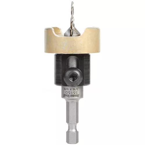 The adjustable depth-stop and independent stop collar prevent marking of the workpiece and perfect countersink depth control.2-Wing Quick release 1/4" hex shank Slow spiral, HSS M2 fully ground tapered drill bit included