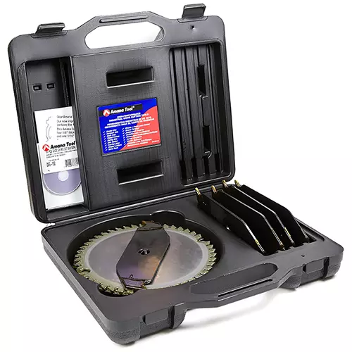 Dadoes (cross-grain cuts) and grooves (cuts with the grain) are cut efficiently on the table saw with a dado stack set. Unlike a wobbler, a stack set produces a flat-bottom cut with chip-free edges. Amana Tool° makes dado stack sets for every machine and every type of woodworking material. The standard width capacity ranges from 1/4" to 13/16". Additional chippers may be purchased separately to expand the capacity beyond 13/16". The standard set, regardless of diameter or tooth count, consists of two outside saw blades and four inside chippers. The outside blades feature hollow-ground plates for proper clearance, and alternate top bevel (ATB) grind with every sixth tooth flat ground (FT).