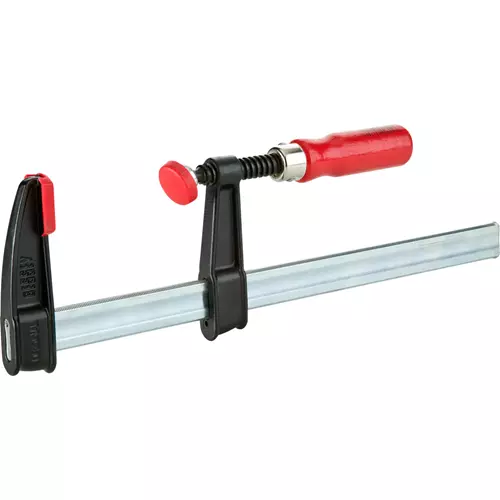 Ideal for sheet metal, stainless steel, light-duty work, and woodworking applications, these Bessey clamps are the choice of professionals worldwide. Tradesman bar clamps feature a unique locking device that is permanently molded into a malleable cast-iron sliding arm, eliminating slippage by interlocking with serrations on the rail. These clamps need no clutching action and have a large Acme thread for fast turning. The large-diameter pad surface comes with protective caps that will minimize dimpling of material while protecting the surface while the ergonomically designed wood handle gives you positive strong clamping.