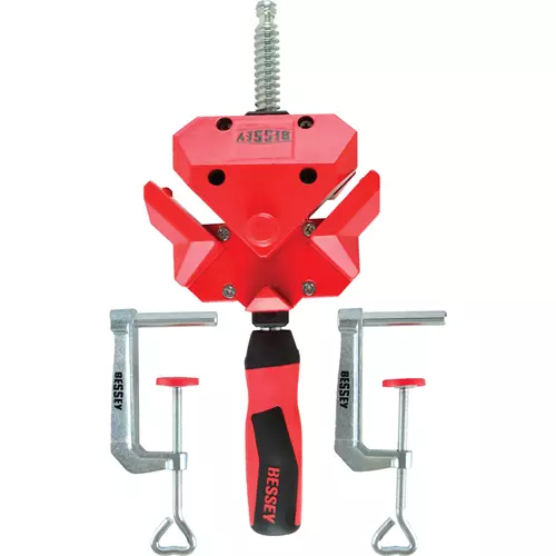 Used in many applications including cabinet work, furniture assembly, and framing, these unique and versatile clamps are designed to hold, fix, and align material at 90 degrees. The jaws are die-cast and plastic-coated with a rear jaw that swivels allowing you to hold different material thicknesses--always at a 90-degree angle, leaving ample clearance to screw, dowel, or staple material together while gluing.