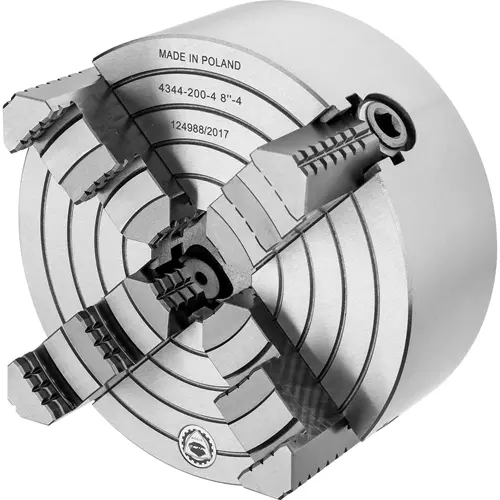 This D1-4 camlock 4-jaw chuck is made with a cast-iron body, hard solid reversible jaws, and come complete with a chuck wrench.