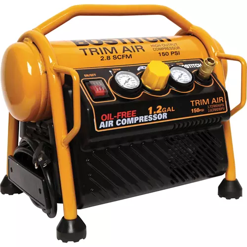 The Bostitch CAP1512-OF 1.2 Gallon Oil-Free High-Output Trim Compressor has a high-output oil-free pump that delivers 2.8 CFM @ 90 PSI and 150 PSI max operating pressure for multiple finish tool operations. The 2.0 HP (Peak), 1.5 HP (Running) motor draws 12 amps for easy start up without tripping circuit breakers. The 1.2 gallon compact design only weighs 23.5 lbs. for easy portability to and from a jobsite. It has an integrated control panel with roll cage that protects gauges from jobsite damage. The LED ON/OFF switch lets you know when the compressor is on to eliminate low-pressure misfires. It has on-board tool and hose storage and a convenient storage pocket for hand tools, fasteners and fittings. The integrated cord wrap improves portability. It also has integrated no-marring rubber feet.