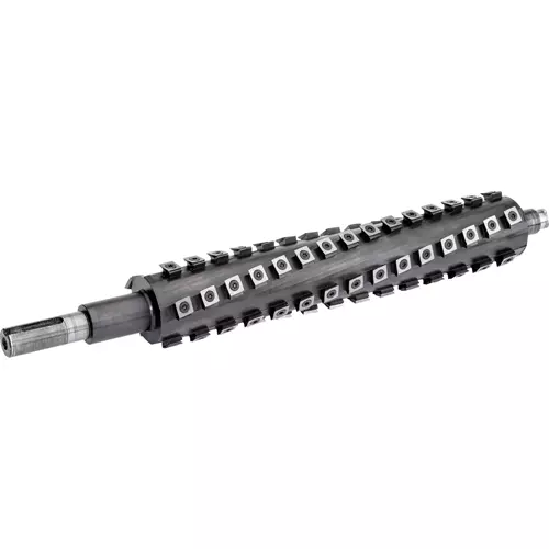 The inserts are positioned along a helical pattern and rotate at a slight angle for a shearing action that leaves a glassy smooth cut on the toughest of woods.