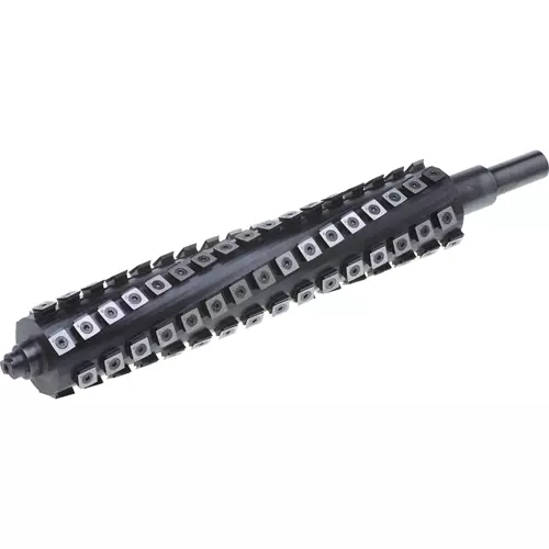 The inserts are positioned along a helical pattern and rotate at a slight angle for a shearing action that leaves a glassy smooth cut on the toughest of woods.