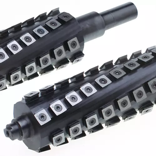 The inserts are positioned along a helical pattern and rotate at a slight angle for a shearing action that leaves a glassy smooth cut on the toughest of woods.