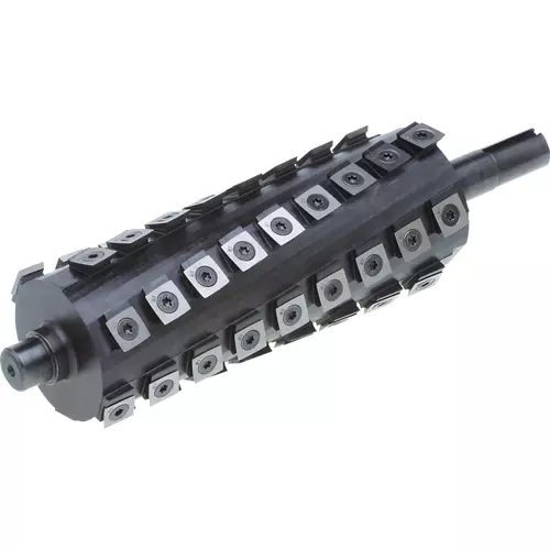 The inserts are positioned along a helical pattern and rotate at a slight angle for a shearing action that leaves a glassy smooth cut on the toughest of woods.