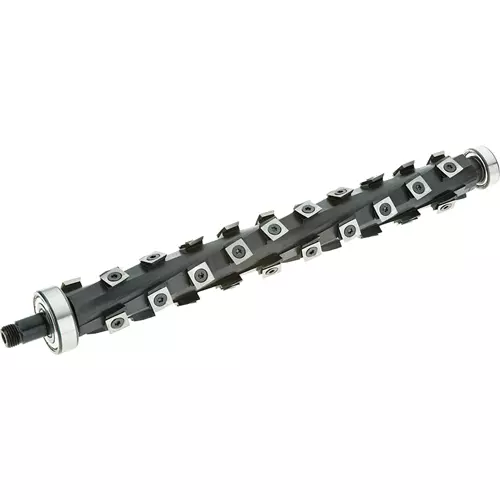 The inserts are positioned along a helical pattern and rotate at a slight angle for a shearing action that leaves a glassy smooth cut on the toughest of woods.