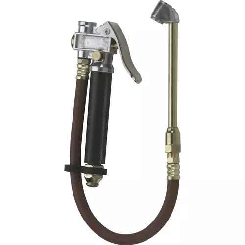 This air chuck with gauge will help you read your tire pressure. It includes a 0-60 PSI gauge, a flexible rubber hose and an air chuck for easy air filling at the valve stem. 1/4" NPT.