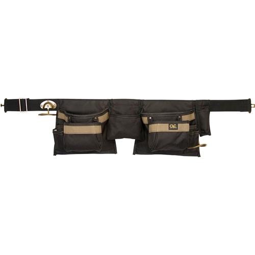 4 main nail and tool pockets 8 smaller pockets, sleeves and holders for pliers, pencils, nail sets, etc. Center pocket for tape, nails, and tools Pry bar or combo square holder Made of polyester fabric and ballistic binding 2" wide web belt with steel buckle Fits waist sizes 29"-46"
