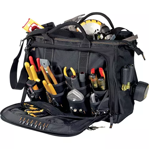 This very popular multi-compartment tool carrier with an extra large center compartment for power tools and two zippered side panels with 58 pockets for all your favorite hand tools. 52 pockets inside and 6 pockets outside to organize tools and accessories; zippered side panels prevent spillage of tools when carrying or storing carrier while the vertical tool pockets keep them in sight for quick access. Approximate size is 18" L x 7" W x 14" H and includes padded handles and an adjustable shoulder strap. Tools not included.