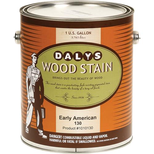Tung oil-based penetrating stain with oil pigment colorants. This excellent wood stain combines the beauty of a hand-rubbed oil finish with the added protection of synthetic resins. It resists fading and damage from sunlight making it ideal for interior and exterior uses alike. Daly's Wood Stain can be wiped, brushed, or sprayed, and on certain surfaces can be used as a finish itself. This product is compatible with all of Daly's wood finishing products as well as most varnishes, urethanes, and lacquers-both water and oil-based. Available in an array of attractive, classic wood tones. 1 gallon of early American color stain.