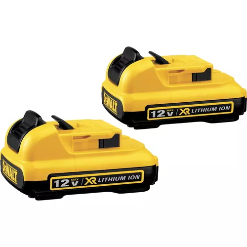 This DeWalt 12V MAX Li-ion Battery Pack has a compact, light weight design that makes it easy to use and fit with a number of products without adding too much extra bulk or weight. No memory and virtually no self-discharge allows for maximum productivity and less downtime. Maximum initial battery voltage (measured without a workload) is 12 volts per battery - nominal voltage is 10.8. Two batteries included, charger sold separately.