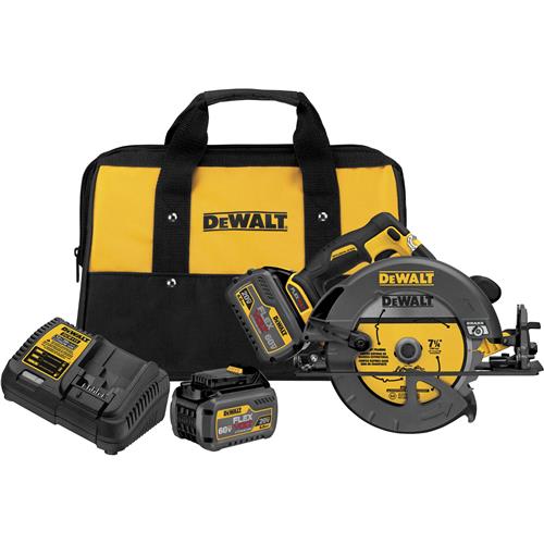 60V MAX 7-1/4" (184mm) Circular Saw delivers the power and depth of cut of a corded circular saw with the power and convenience of a cordless tool. The kit includes 2 60V MAX Lithium Ion battery packs and a DCB115 charger.