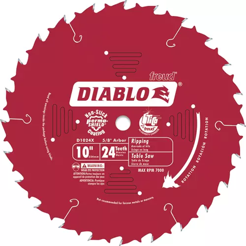 This Diablo saw blade is designed to meet the needs of the construction and remodeling market. This advanced laser cut blade features a thin kerf, making it ideal for portable and low powered saws on the jobsite. A permanent Perma-SHIELD coating keeps this blade free from gumming and corrosion, and laser-cut stabilizer vents reduce vibration and heat buildup for more precise cuts and longer cutting life. This blade is the top choice for contractors who want a smooth finish when ripping. Ideal for ripping oak, pine, pressure treated lumber and plywood.