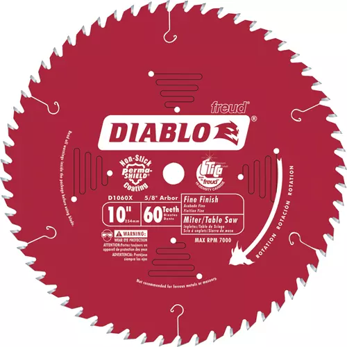 For a clean-cutting blade that creates smooth finish cuts in material such as veneer plywood and delicate hardwood, look no further than the D1060X Diablo 10-Inch Fine-Finish Saw Blade. This is your go-to blade for slicing through oak, pine, melamine, veneer plywood, and delicate molding. This blade's high tooth count minimizes grabbing of the workpiece, producing cuts that require little to no sanding. For strong, long-lasting resistance, the blades feature a tough steel plate and high-density carbide tips.