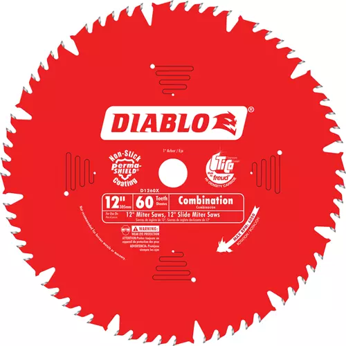 Diablo's new ultra thin kerf Combination saw blade.The ATB Grind + Raker tooth design allows for straighter rips and improved performance. The deep gullet design allows for cutting thicker stock while maximizing number of teeth. Blade features Frued's TiCo Hi-Density carbide for extreme durability and cutting life up to 4 times longer than standard carbide, Perma-Shield Coating for less drag, gumming and corrosion, Laser Cut Stablilizer vents for less vibration and quieter cleaner cuts, Tri-Metal Shock Resistant Brazing to withstand exteme impact and you have a saw blade that "Cuts Like a Hot Knife Through Butter". 12-Inch diameter, 60t ATB/R, and 1-Inch arbor.