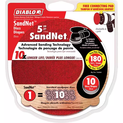Diablo’s SandNET™ discs with reusable sanding technology are the most advanced sanding discs on the market with up to 10x longer life versus standard sanding discs. The universal NET design fits all 5 and 8-hole sanders. Each SandNET™ discs features a clog-reducing nylon NET design coated in a premium ceramic blend grit for fast material removal while reducing material build-up. The SandNET™ design is easy to clean and reuse multiple times by simply shaking, vacuuming, or rinsing the disc to remove any pitch build-up. Includes a free connection pad (a $5 value) for easy attachment to sander.