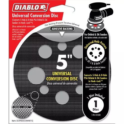 Diablo's premium 5" Random Orbital Sander Universal Conversion Disc with Hook and Lock backing converts 5-hole and 8-hole Pressure Sensitive Adhesive (PSA) Orbital and DA sanders to Hook and Lock. Diablo's conversion disc includes break-through innovations that improve performance, extend sanding life and increase productivity.