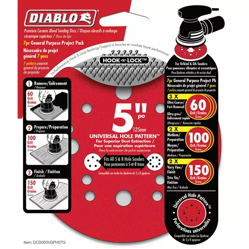 Diablo's premium 7-piece General Purpose Pack includes all the grits needed to complete your refinishing project. This project pack contains three 60-Grit, two 100-Grit, and two 150-Grit discs. These universal, 12-hole random orbital sanding (ROS) discs feature Hook & Lock™ backing and includes break-through innovations that improve performance, extend sanding life and increase productivity. Featuring a premium ceramic blend, these discs remove material faster than other sanding discs and offer an extra long sanding life. Clog-SHIELD, Diablo's own blend of grinding agents, reduces loading thus maximizing productivity. The superior grit-to-backing bond, ENDURA-BOND, provides Diablo's sanding discs with longer life and extreme durability.