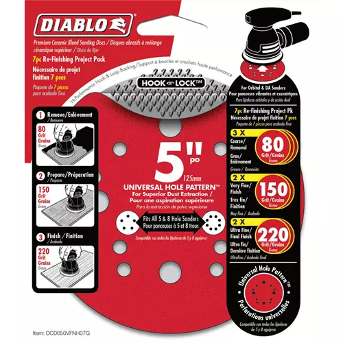 Diablo's premium 7-piece refinishing project pack includes all grits needed to complete your refinishing project: three 80-Grit, two 150-Grit, and two 220-Grit discs. These universal, 12-hole random orbital sanding (ROS) discs feature Hook & Lock™ backing and includes break-through innovations that improve performance, extend sanding life and increase productivity. Featuring a premium ceramic blend, these discs remove material faster than other sanding discs and offer an extra long sanding life. Clog-SHIELD, Diablo's own blend of grinding agents, reduces loading thus maximizing productivity. The superior grit-to-backing bond, ENDURA-BOND, provides Diablo's sanding discs with longer life and extreme durability.