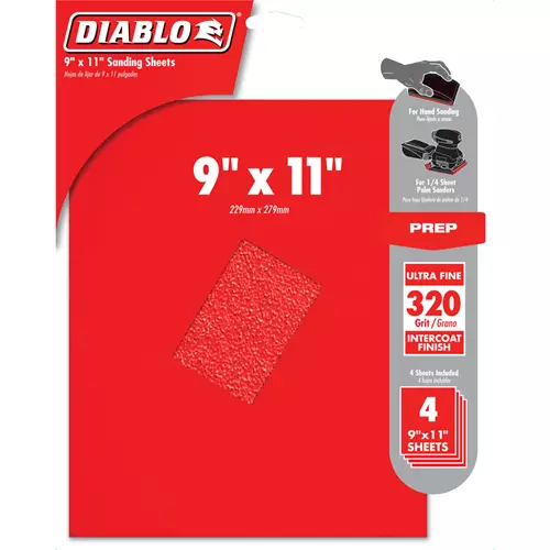 Diablo's premium 9" x 11" 320-Grit (Ultra Fine) Sanding Sheets include break-through innovations that improve performance, extend sanding life and increase productivity. These sanding sheets are designed for use in 1/4 sheet palm sanders, 1/2 sheet sander and hand sanding.