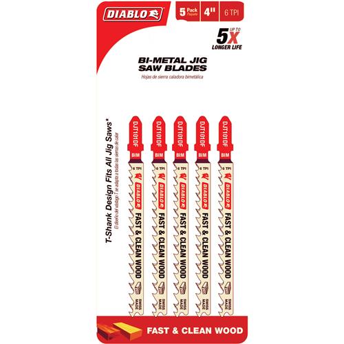 T33797 4" 6 TPI T-Shank Bi-Metal Jigsaw Blades for Fast Cuts in Wood, 5 pk.