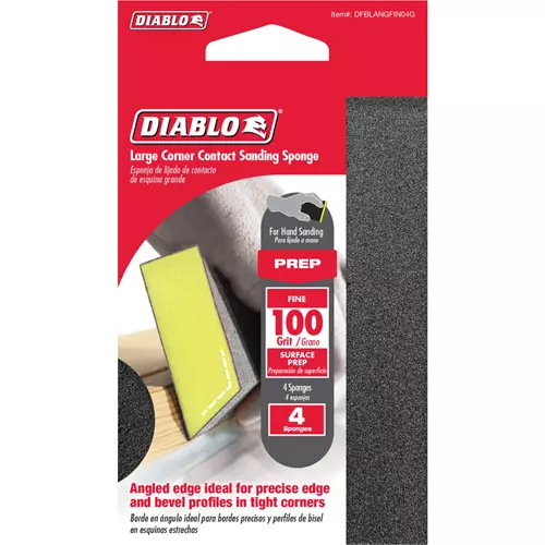 Diablo's premium corner contact sanding sponges include break-through innovations for superior sanding performance, extended sanding life and increased hand-sanding productivity. Featuring a premium aluminum oxide blend, these dual-edge sanding sponges remove material faster and offer up to 3X longer sanding life versus standard hand sanding sheets. The sanding sponge’s angled edge creates precise edge and bevel profiles in tight corners and the longer length allow for sanding medium surface areas. The full contact design provides maximum sanding potential by delivering consistent scratch patterns and ultra-smooth finishes. The superior grain bonding system, ENDURA-BOND™, provides Diablo's sanding blocks with longer life and extreme durability.
