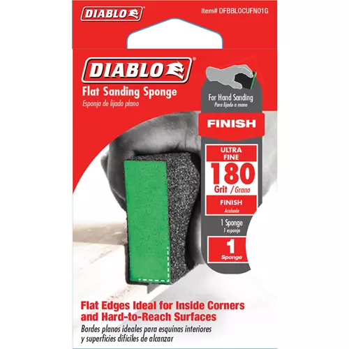 Diablo's premium flat edge sanding sponges include break-through innovations for superior sanding performance, extended sanding life and increased hand-sanding productivity. Featuring a premium aluminum oxide blend, these flat sanding sponges remove material faster and offer up to 3X longer sanding life versus standard hand sanding sheets. The flat edges make it easy to access inside corners and hard to reach surfaces. The full contact design provides maximum sanding potential by delivering consistent scratch patterns and ultra-smooth finishes. The superior grain bonding system, ENDURA-BOND™, provides Diablo's sanding blocks with longer life and extreme durability.