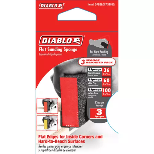 Diablo's premium flat edge sanding sponges include break-through innovations for superior sanding performance, extended sanding life and increased hand-sanding productivity. Featuring a premium aluminum oxide blend, these flat sanding sponges remove material faster and offer up to 3X longer sanding life versus standard hand sanding sheets. The flat edges make it easy to access inside corners and hard to reach surfaces. The full contact design provides maximum sanding potential by delivering consistent scratch patterns and ultra-smooth finishes. The superior grain bonding system, ENDURA-BOND™, provides Diablo's sanding blocks with longer life and extreme durability.