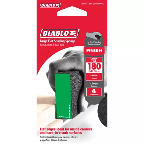 Diablo's premium flat edge sanding sponges include break-through innovations for superior sanding performance, extended sanding life and increased hand-sanding productivity. Featuring a premium aluminum oxide blend, these flat sanding sponges remove material faster and offer up to 3X longer sanding life versus standard hand sanding sheets. The flat edges make it easy to access inside corners and hard to reach surfaces and the longer length allow for sanding medium surface areas. The full contact design provides maximum sanding potential by delivering consistent scratch patterns and ultra-smooth finishes. The superior grain bonding system, ENDURA-BOND™, provides Diablo's sanding blocks with longer life and extreme durability.