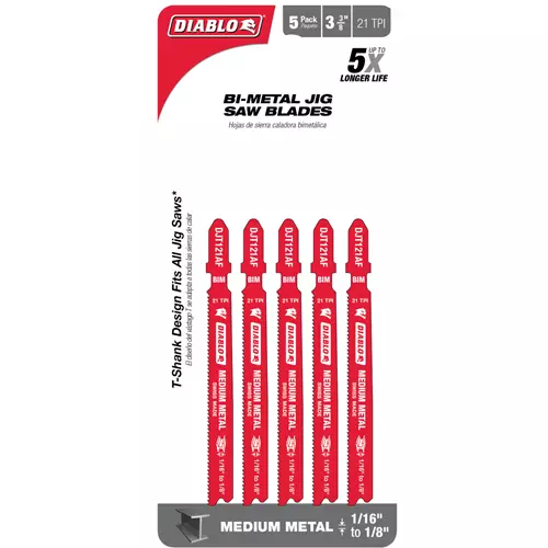 T33802 3-5/8" 21 TPI T-Shank Bi-Metal Jigsaw Blades for Medium Metal, 5 pk.