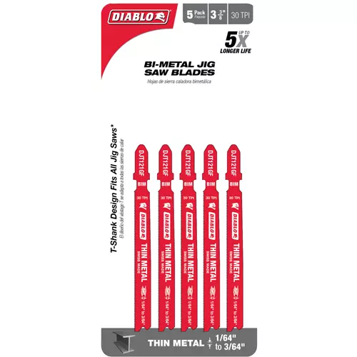 Diablo’s bi-metal teeth jigsaw blades are designed for maximum durability, longer life, and speed in medium metal applications ranging from 1/64” to 3/64” thickness.