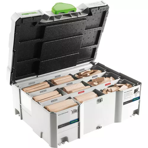An indispensable compliment to the Domino XL, the new assortment systainer is available in both 8,10 mm and 12,14 mm configurations, so you can take just what you need to the workpiece whether in the workshop or on the jobsite. Based on a systainer 2, the new design accommodates all the standard tenon sizes and features durable plastic containers that can be easily removed or replaced for application specific setups. Get organized for better and faster results.