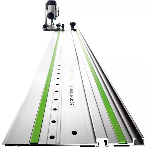 The FS 1400/2-LR 32 Guide Rail (55 inches) was designed specifically for use with Festool Routers and the LR 32 Hole Drilling System to construct cabinets using the European frameless 32mm system for shelf pins and hardware. Also, use the LR 32 System for line boring, or setting shelf pins in panels up to any length. Festool FS Guide rails are available in eight different lengths from 32 inches to 197 inches (800 - 5000 mm), providing the right rail for every application. For cutting applications, the integrated splinterguard aligns perfectly to your cut line, saving set up time and serving as protection against tear out, on cuts both with the grain and across. Guide rails can be easily connected using the accessory guide rail connectors for a rigid, secure and continuous connection. Guide rails make work easier by taking the tool to the work, and save time and money by eliminating laborious measurements, rework and wasted material. Use the FS 1400/2-LR 32 Guide Rail (55 inches) with the Festool Plunge cut saw to cut material up to 49 inches. Connect rails using Festool Guide Rail Connectors to make limitless cuts.