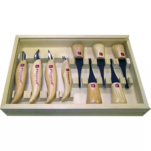 The set includes four razor-sharp carving knives and five palm tools and is packaged in a sturdy wooden box for convenient and safe storage in any work area.