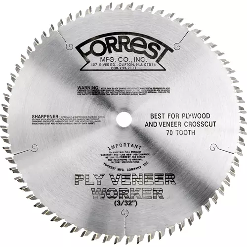 This commercial-quality blade is ideal for rip and cross-cutting two sided veneer plywood, whether finished or unfinished. It is also perfect for cutting solid woods. In fact, there is no comparable blade on the market today. The Ply Veneer Worker (PVW) uses the same high-precision technology that's behind the popular Forrest Woodworker II blade. Designed for cutting wood products only.