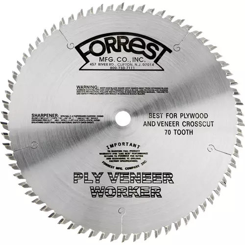 This commercial-quality blade is ideal for rip and cross-cutting two sided veneer plywood, whether finished or unfinished. It is also perfect for cutting solid woods. In fact, there is no comparable blade on the market today. The Ply Veneer Worker (PVW) uses the same high-precision technology that's behind the popular Forrest Woodworker II blade. Designed for cutting wood products only.