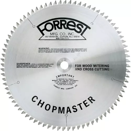 For chop saws and radial arm saws. These top quality miter saw blades produce perfectly cut miter joints. Made with double hard C4 submicron carbide for up to 300% longer life. A heavier than normal steel plate and a negative face hook maintain maximum stability for the best cut. Each blade is hand straightened to a runout of 0.001/0.002 for maximum cut quality. The tooth style (4 points and a flat) maximizes steady, clean cuts with no bottom splintering. You will be amazed by the extra-smooth, tight cuts you will get with this blade.Kerf: 7/64"