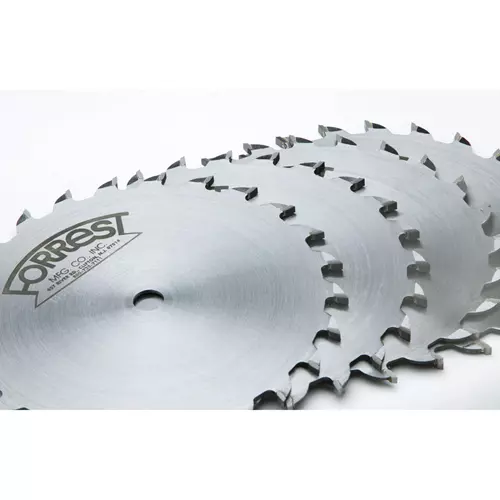Four reversible, interlocking 8" blades. With 24 teeth each and standard 5/8" bore. Blades reverse to make 3/16" and 5/16" cuts or 1/4" and 3/8" cuts. Precision cutting for fine joinery. Create quality finger or box joints for joining two pieces of wood at right angles. Excellent for cutting rabbets (grooves). Great for doors, casement windows, window frames, accommodating panels in furniture construction and other woodworking applications. Solid performance. Like all Forrest blades, the 4-Piece Finger Joint Sets have high-grade carbide tips and are hand straightened. Exceptional perimeter concentricity produces a flat bottom groove. Long Life. Forrest's proprietary grinding techniques produce blades that last up to 300% longer between sharpenings. Affordable, state-of-the-art, in-factory sharpening services are available when needed. For craftsmen who want the best. They are the only American-made, high quality finger joint sets on the market today. Ideal for fine woodworking applications and professional shops.