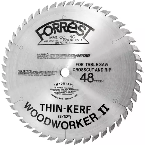 With this all purpose thin kerf blade for table saws you can rip and crosscut 1" - 2" rockhards and softwoods resulting in a smooth as sanded surface. With 20° face hook, ply veneers will crosscut with no bottom splinter at moderate feed rates. Double hard and 40% stronger C4 carbide will give up to 300% longer life between sharpenings. Ends blade changing (one blade does rip, combo and crosscut), second-step finishing and cutting 1/16" oversize to allow for resurfacing. Buy and sharpen one blade instead of 3 (24T rip, 50T combination and 80T crosscut).Kerf: 3/32"