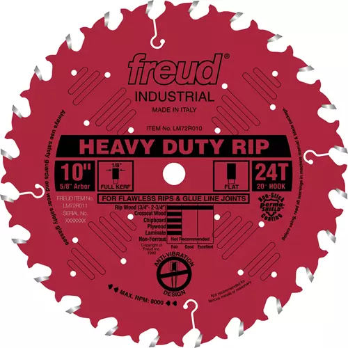 This blade gives smooth, fast rips in hardwoods and softwoods. The combination of a rigid blade body and razor sharp flat top carbide teeth will provide a "glue line" precision cut. These blades are precision balanced and can be used in gang-rip operations. The ideal working range is from 3/4" to 2-3/4" thick. This blade also features laser cut anti-vibration slots, practically eliminating the vibration that resonates in standard blades. With this ultimate ripping blade, there is no need for stabilizers.
