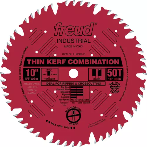 The ultimate combination blade is now available in a thin kerf design with Freud's LU83R. The groups of five teeth include one flat tooth for ripping, followed by four alternate top bevel teeth for crosscutting and a large gullet for effective chip clearance. This blade also features laser cut anti-vibration slots, practically eliminating the vibration that resonates in standard blades. With this combination blade, there is no need for stabilizers.