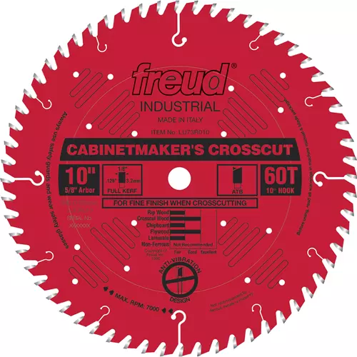 Freud's new Cabinetmaker's crosscut blade includes a 38 degree Hi-ATB (Alternate Top Bevel) tooth grind will deliver excellent crosscuts in double-sided veneer plywood or double-sided melamine. With its newly added Perma-SHIELD coating and tooth geometry, this blade is designed primarily for heavy use in a cabinetmaker's shop. This blade is ideal for cutting in hardwood, softwood, plywood, and chipboard in thicknesses from 1/2" to 2-3/4". Kerf: 1/8"