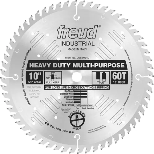 This multi-purpose blade will cut stacks of manmade wood products as well as hardwood and softwood up to 2-3/4" thick. The blade's deep gullets and TCG rip and crosscut through hardwoods and softwoods with ease. Although the ideal working range is 1/2" to 2-3/4" thick, thinner or thicker materials may be cut, resulting in some loss of surface finish.
