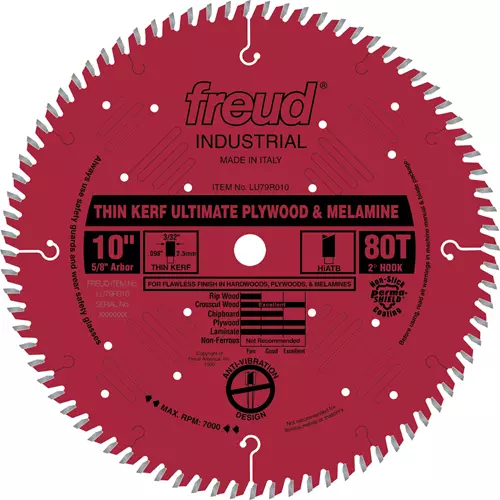 Using advanced technology, Freud developed the LU79 thin kerf line of saw blades that features laser-cut, anti-vibration slots that practically eliminate the vibrations that resonate in standard blades. This blade provides flawless, chip-free edges in veneered plywoods, fine moldings, melamine, laminates, and crosscuts in solid woods. The combination of Hi-ATB tooth design and anti-vibration slots makes these thin kerf blades the ultimate finish blades. The result is a cut so smooth it eliminates the need for a stabilizer or a scoring blade!