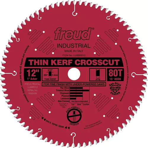 This Perma-SHIELD™ coated blade gives new life to underpowered saws and produces smooth crosscuts in hardwoods, softwoods and moldings. Coated blades pull 1/3 less on the saw, which translates into 33% more cutting power. Thin kerf blades remove less material than standard carbide blades, thus requiring less horsepower to produce equally good results.