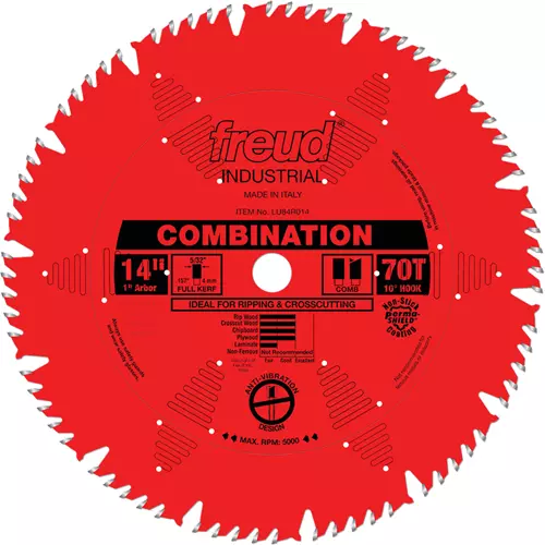 Specifications: Arbor: 1" Diameter: 14" Grind: COMB Hook Angle: 10° Kerf: .157" Plate: .118" Teeth: 70