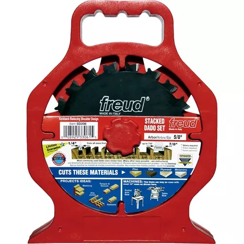 Freud's quality and craftsmanship in a stacked dado set, but at a wobble dado price! The negative hook angles make flat bottom grooves and virtually splinter-free cuts. It has two outside blades with three two wing chippers. This makes it ideal for underpowered saws because it requires less power to feed. All blades and chippers come with Freud's antikickback design. This resharpenable set will produce grooves from 1/4" to 7/8". This dado set comes with a shim set and carrying case as well as instructions on how to make basic dado sizes.